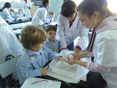 Gracias a deshacer el algodón del pañal y quedarnos con las bolitas de poliacrilato y un poco de agua... hemos hecho que pareciera nieve. Después, con la ayuda de los alumnos de Bachillerato hemos dado forma a un muñeco de nieve...¡divertidísimo!